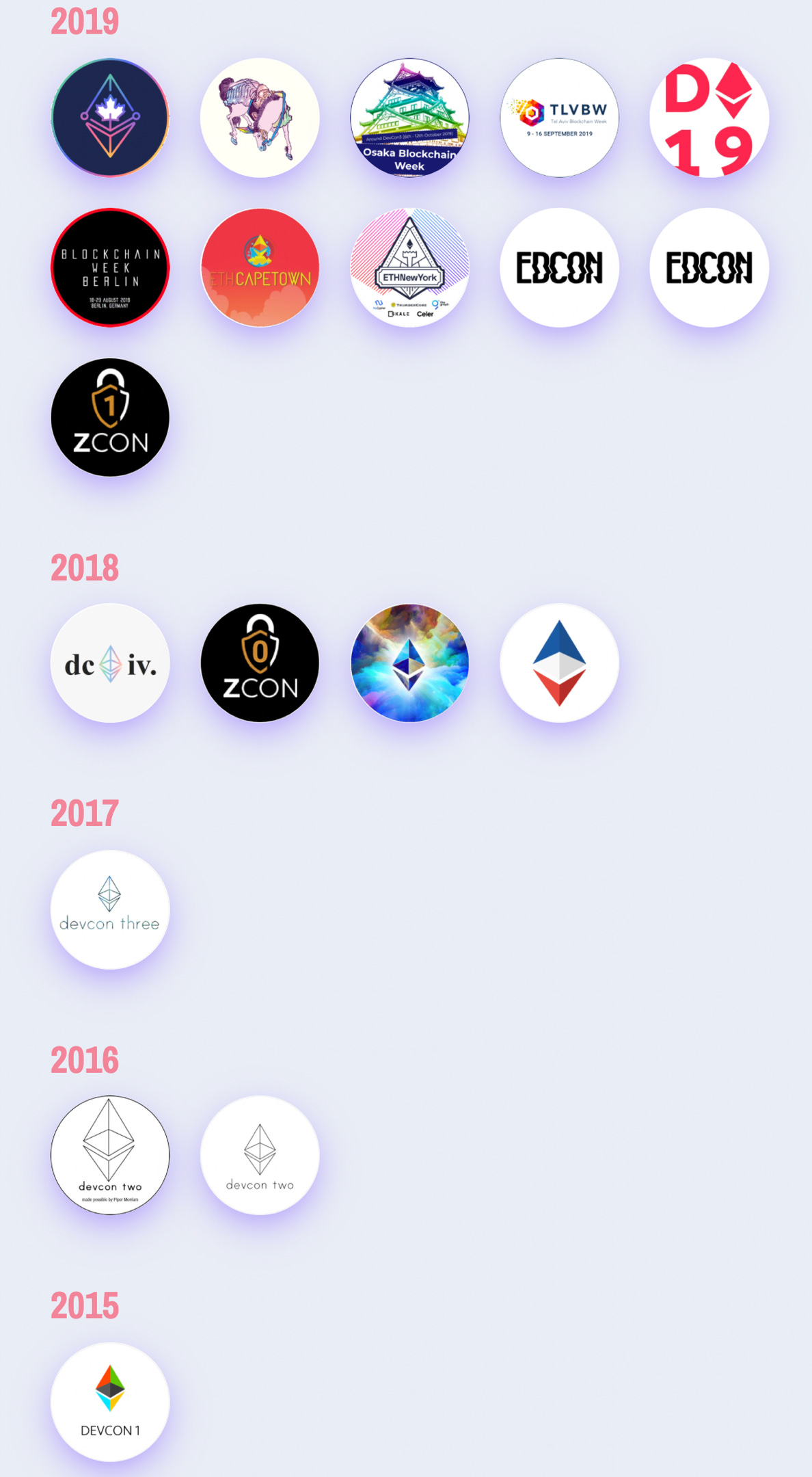 下圖就是以太坊創辦人 Vitalik Buterin 的 POAP 收藏。他自 2015 年起連續每年都參與 Devcon 以太坊開發者大會,明顯是以太坊的核心參與者。
