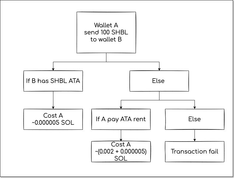 當 A 錢包把 SHBL 傳送給 B 錢包的時候,如果 B 錢包裡面沒有 SHBL 的帳號,A 可以選擇支付 ATA 押金(約 0.002 SOL),幫 B 錢包開一個 SHBL 的帳號;反之,如果 B 錢包裡面已經有 SHBL 的帳號,那 A 就只需要付約 0.000005 SOL 的手續費,基本上可以無視。