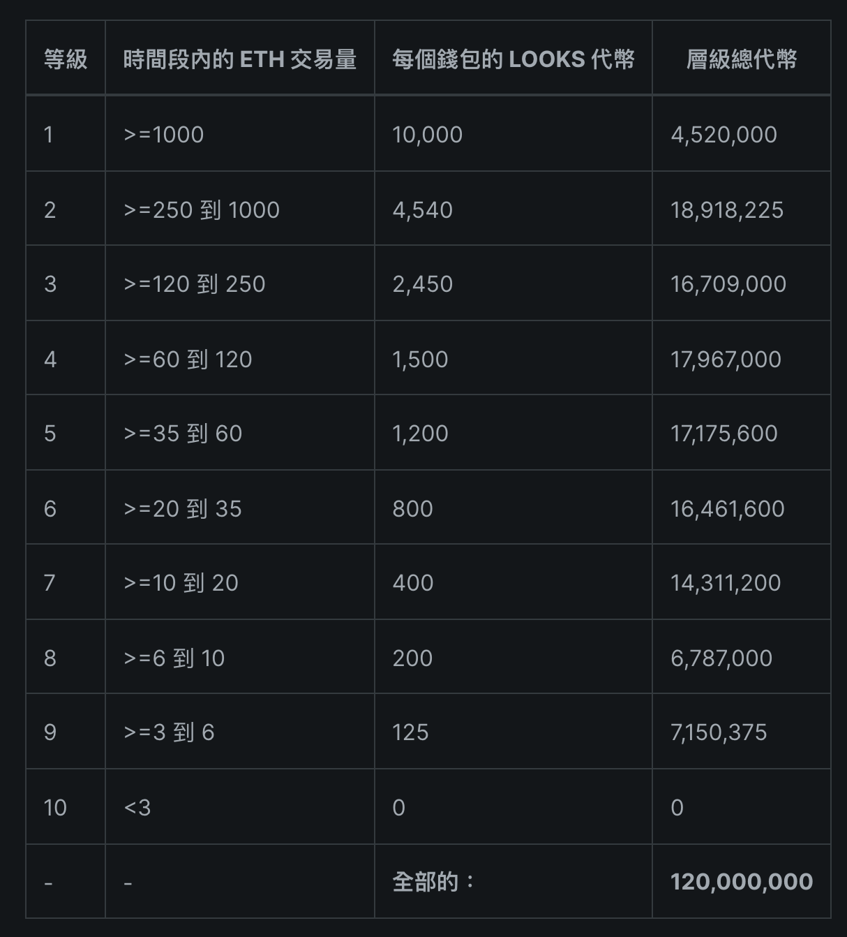 因此 LooksRare 就從區塊鏈上篩選出過去半年,曾經在 OpenSea 買賣過 NFT 而且交易金額大於 3 ETH 的錢包地址空投 LOOKS 代幣。交易總金額越高,能領到的 LOOKS 空投就越多。但前提是這些人必須先在 LooksRare 上架至少一款 NFT 才行。