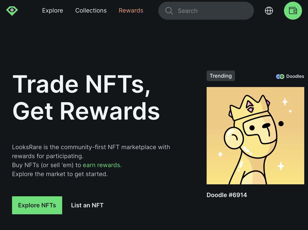 LooksRare 是以社群為優先的 NFT 交易市集,我們以 LOOKS 代幣獎勵積極參與的交易者、收藏家與創作者。平台全部的交易手續費,收入都會回饋給 LOOKS 代幣的抵押者。此外,創作者在銷售時也可以立即獲得版稅回饋。