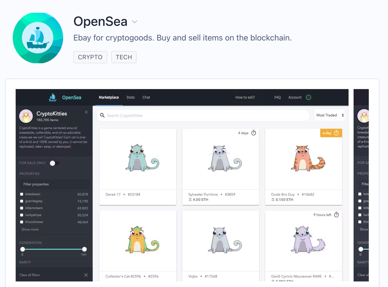 2017 年 12 月,以太坊上的第一個 NFT 開放市場 OpenSea 正式上線,號稱「加密商品的 eBay」。OpenSea 從每筆買賣中抽取 2.5% 當成交易手續費。低廉的手續費,吸引不少謎戀貓賣家改到 OpenSea 上架銷售。