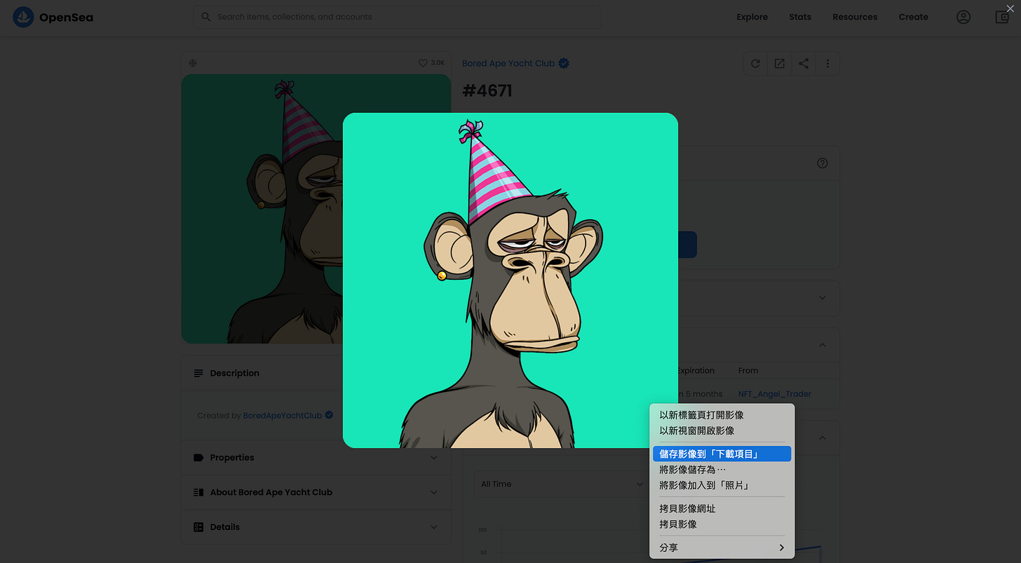 許多人在購入 NFT 之後,會將社交頭像換成與 NFT 相同的圖片。但其實這些 NFT 圖片,都可以在 OpenSea 上任意下載。換句話說,即便沒買 BAYC 的人也可以自行下載並換上「猴子」頭像以假亂真。反正,幾乎沒人知道你是不是真的持有 BAYC。