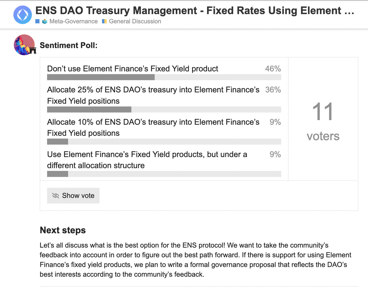 由於提案者 CPSTL 身兼 Element Finance 創辦人卻沒有事先揭露利益衝突,因此遭到部分人反對。也有民意代表擔心,將資金放入 DeFi 比純粹持有加密貨幣風險更高。多數人都認為要深入了解 Element Finance 之後才能決定。