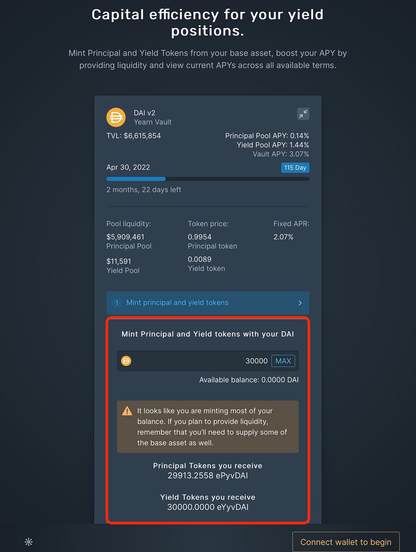 同樣假設每顆 ETH 價格是 3,000 DAI,10 顆 ETH 就能換成 30,000 DAI。接著,如下圖所示,將這 30,000 DAI 透過 Element Finance 的活存頁面(Mint&LP),將它鑄造成約 29,913 顆本金代幣(ePyvDAI)和 30,000 顆收益代幣(eYyvDAI)。