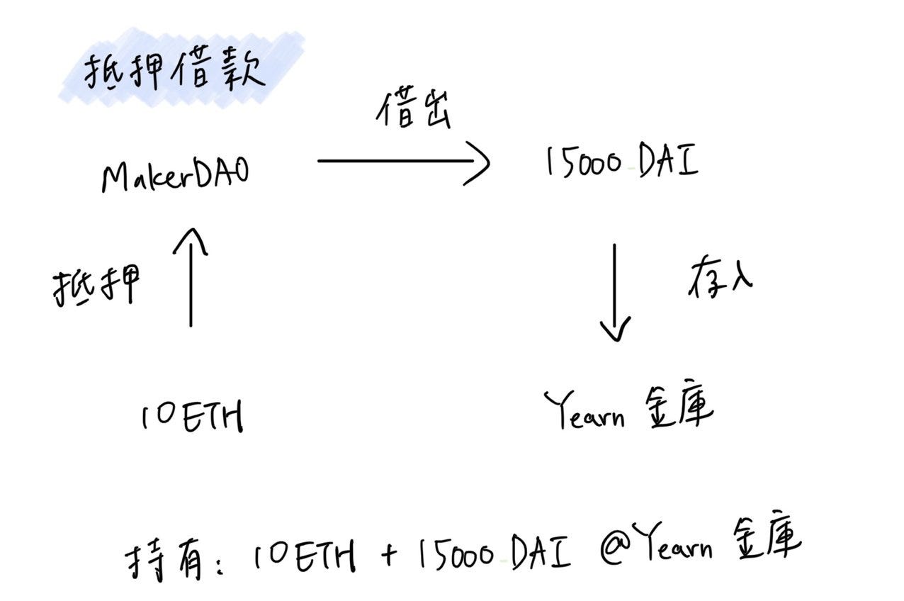 假如每顆 ETH 價格是 3,000 DAI,投資者也可以將額外借來的 15,000 DAI(等值 5 顆 ETH)拿去 Yearn 金庫²賺穩定幣收益。等於是拿原本的 10 顆 ETH 在賭幣價上漲,而借來的 15,000 DAI 在賺穩定幣利息。