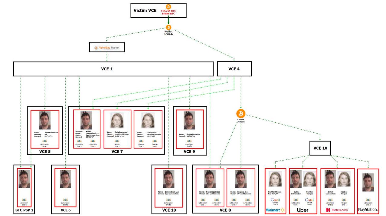 這些行為是在模糊比特幣的資金流向,使執法部門難以追蹤資金。但執法部門仍然透過鏈上交易資料以及交易所的人頭帳戶信箱,循線追查到由俄籍美國人李赫登斯泰(Ilya Lichtenstein)和他妻子摩根(Heather Morgan)管理的多個帳戶。