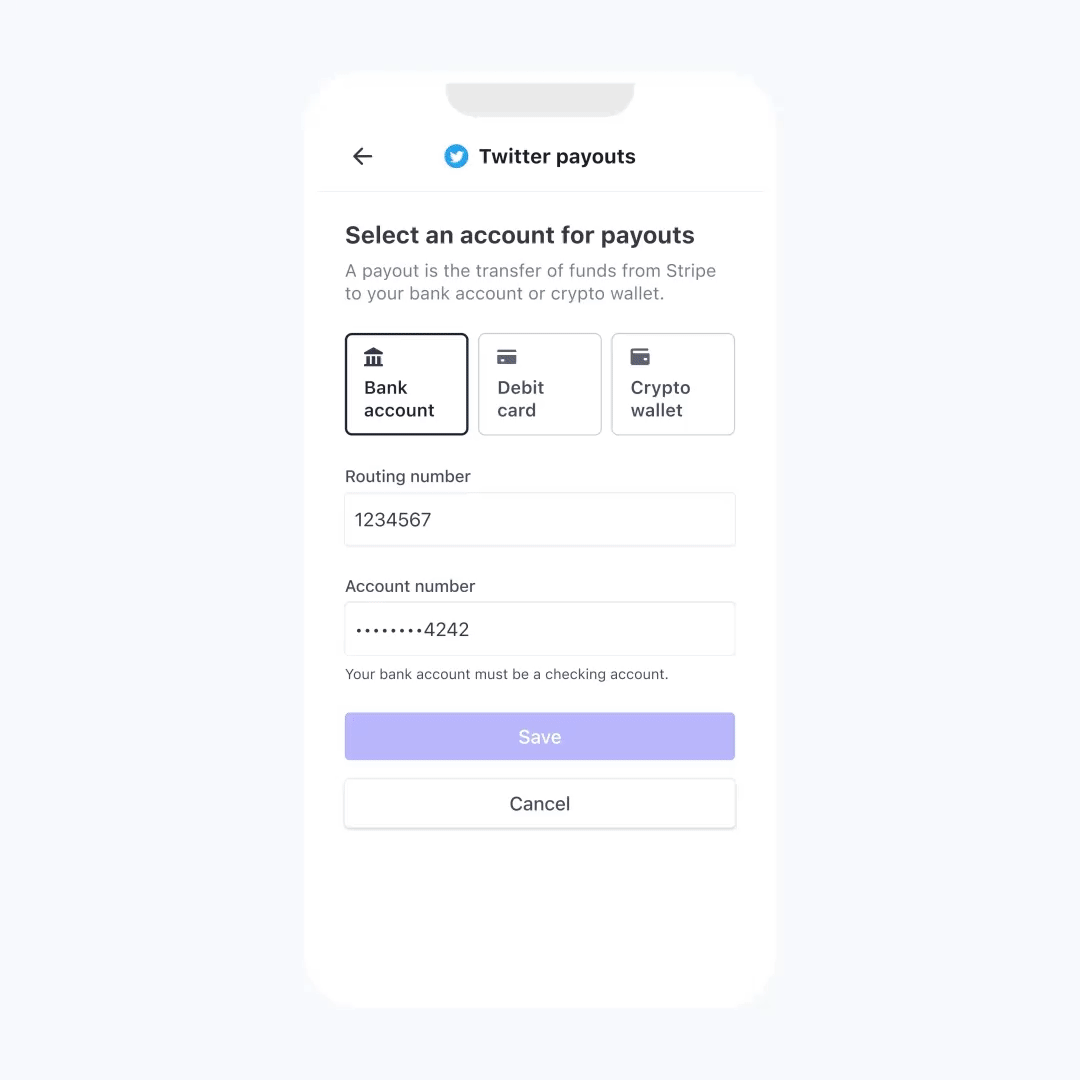 Twitter 平台上的這些金流,背後都是交由 Stripe 處理。因此近期 Stripe 開始支援加密貨幣提領,Twitter 上的創作者也能跟著受惠。下圖就是 Stripe 提供的操作畫面,設定步驟非常簡單。未來無論人們以什麼幣種支付,創作者最終都可以選擇以 USDC 提領。