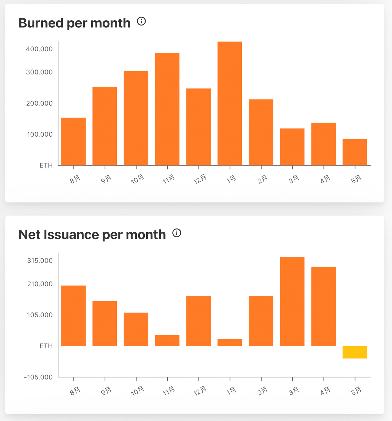 5 月才剛開始,但 ETH 的單月發行量卻出現前所未見的負成長。在我寫文章當下,以太坊在 2022 年 5 月的淨發行量為 -42,354 顆 ETH。這並不是顯示錯誤,而是有大量的 ETH 在過去幾天因為猿宇宙土地的搶購熱潮,而被系統的 EIP-1559 機制給燒掉了。