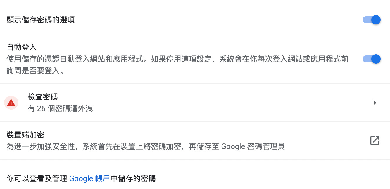 只不過,理想與現實總是有差距。如下圖所示,Chrome 早在幾年前就不斷提醒,我在 26 個網站使用的同一組密碼遭到外洩,但每當我看到那些都是無關緊要的網站,就懶得去改。