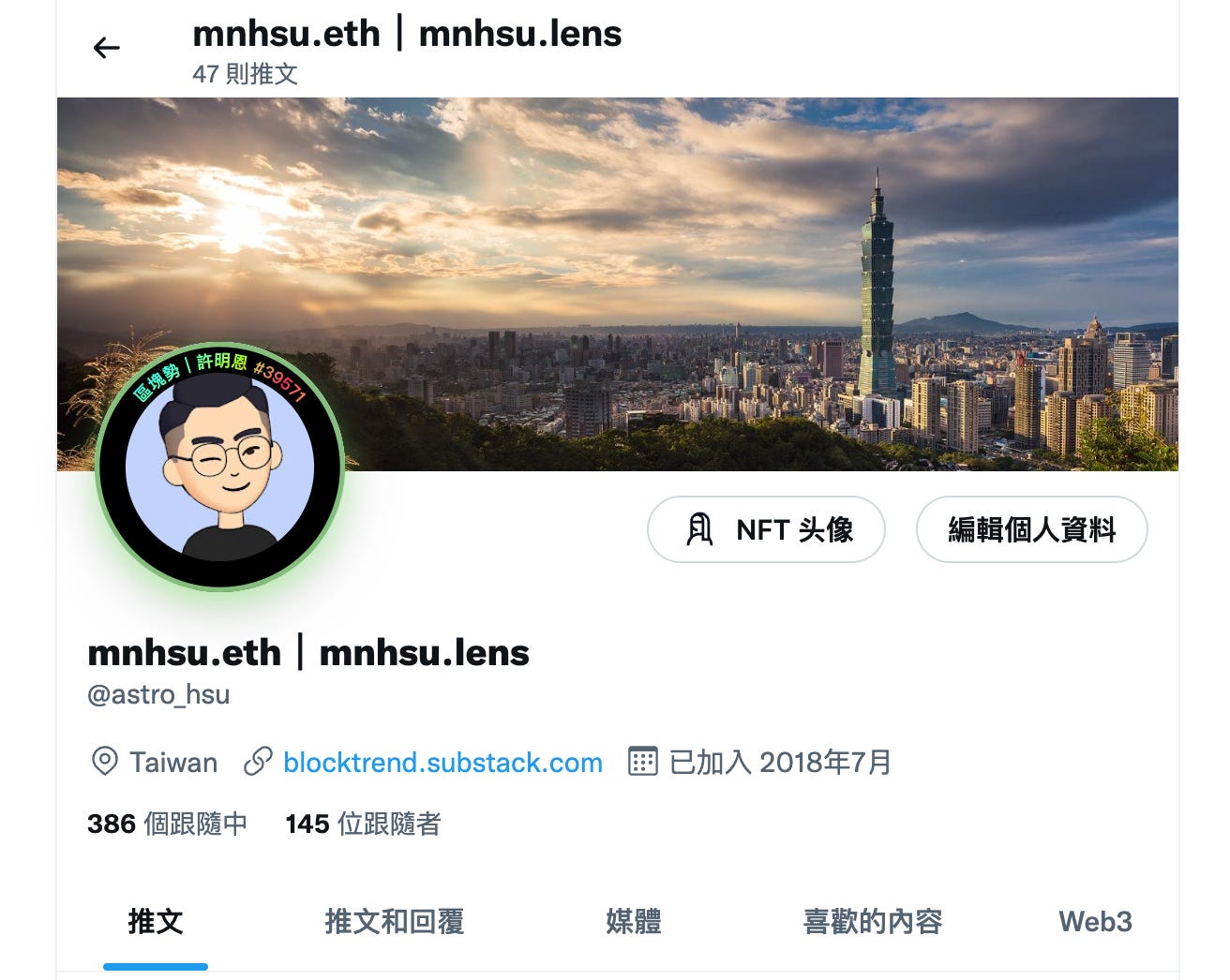 下圖是我的推特頁面。安裝 Mask Network 外掛元件後,就會出現 NFT 頭像按鈕。只要將你的個人錢包與 MASK ID 綁定,就能將錢包內的 NFT 設定成為社交頭像,並獲得黑色外框的認證標記。