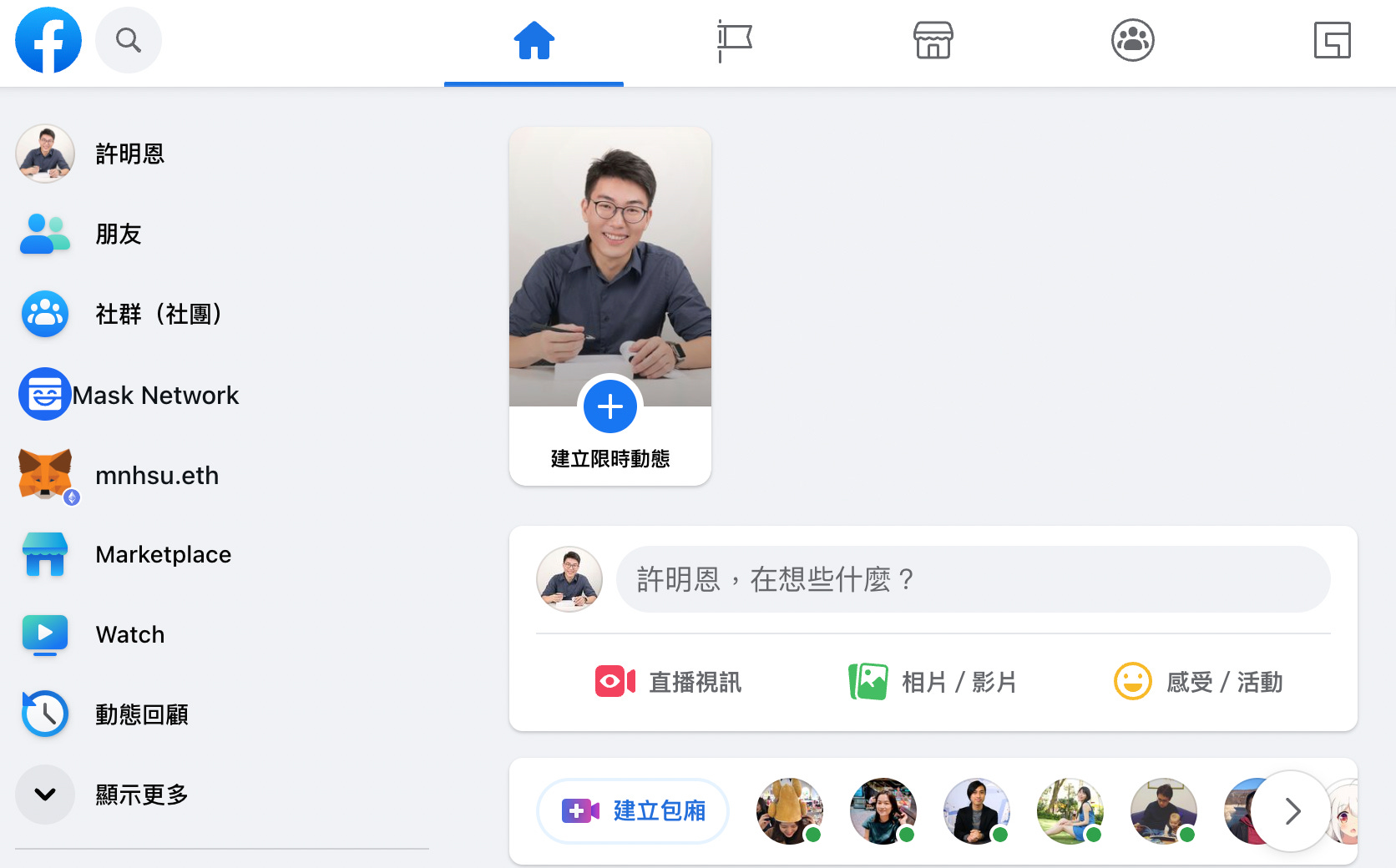 以下圖為例,在瀏覽器安裝外掛元件後,臉書的左邊欄位會多出兩個全新按鈕,分別是 MetaMask 錢包和 Mask Network。前者把 MetaMask 交易視窗嵌入臉書頁面,後者則像是外掛在臉書平台上的 Web3 工具箱。