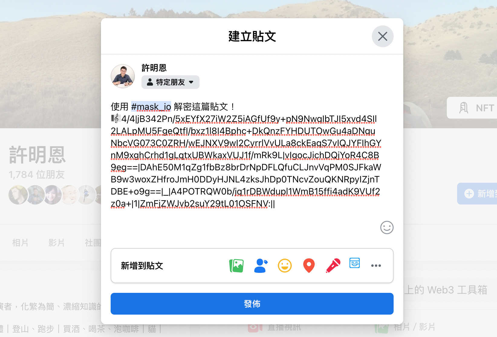 從貼文就變得不同。發文時我可以點選旁邊的 Mask Network 小圖示,改以外掛元件發表加密貼文。Mask Network 會自動替文字加密,變成一串看來像亂碼的內容。只有指定的使用者才看得懂這串「亂碼」,臉書也不會知道,這就能保護隱私。