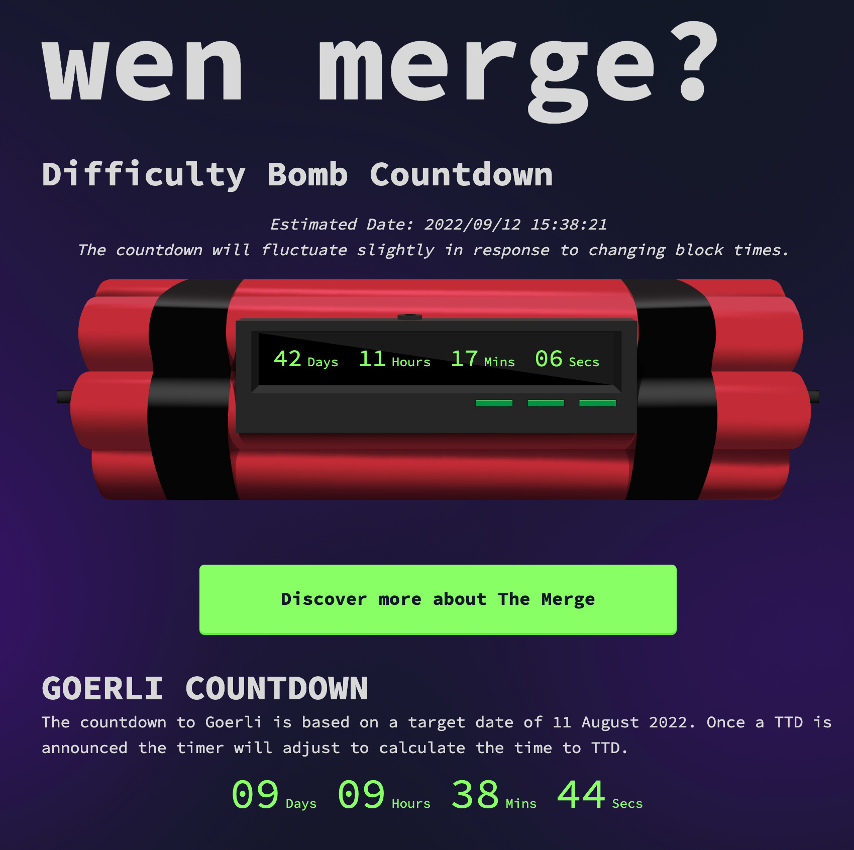 如果現在再問一次,以太坊何時升級?答案仍然是不知道,但已經可以預測。根據 Wen Merge 網站的預估,以太坊會在 2022 年 9 月 12 日合併,也就是一個多月之後。雖然這個時間隨時還可能再往後延,但幾乎可以肯定不會拖到 2023 年(吧)。
