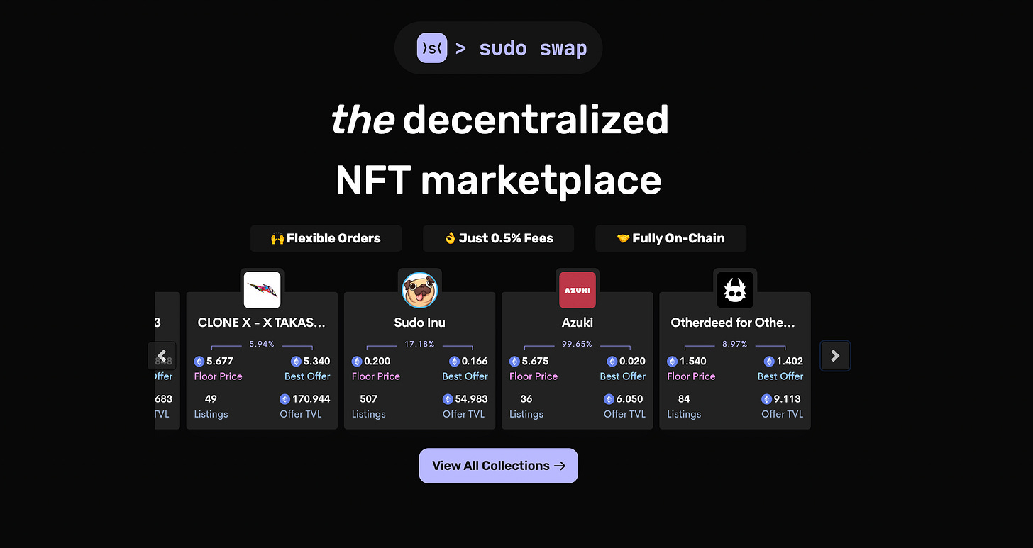 Sudoswap 最初也是從經營「NFT 菜市場」起家,功能與 OpenSea 相同,甚至還主打零手續費。只不過,OpenSea 早就已經是 NFT 菜市場的代名詞,後進者4就算不收場地費也很難與它競爭。
