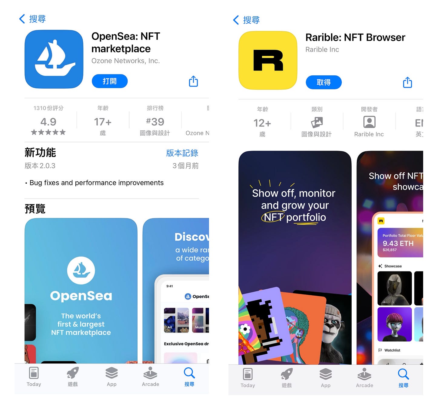 下方是 OpenSea 的 app 下載頁面。雖然 app 名稱是「OpenSea:NFT Marketplace」,但實際打開應用就會發現無法買賣 NFT。使用者只能在裡面瀏覽賣場上有哪些 NFT,根本稱不上是市集。另一個 NFT 市集 Rarible 就「誠實」許多,app 名稱是「Rarible:NFT Browser」,直接告訴使用者這款 app 只能用來瀏覽,沒有實際的交易功能。