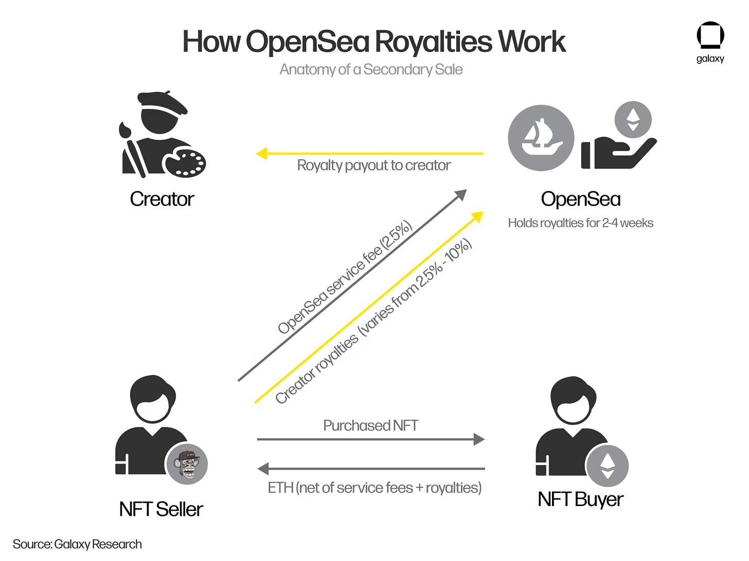 Yuga Labs 為每隻無聊猿設定 2.5% 版稅。每當有人透過 OpenSea 轉手賣出無聊猿時,成交價格的 2.5% 就會回到 Yuga Labs 口袋。以下圖為例,假如我用 100 顆 ETH 在 OpenSea 上買入無聊猿,賣家實收的錢只會有 95 顆 ETH。少掉的 5 顆 ETH 中,有 2.5 顆是 OpenSea 的手續費,另外 2.5 顆就是要支付給 Yuga Labs 的 NFT 版稅。