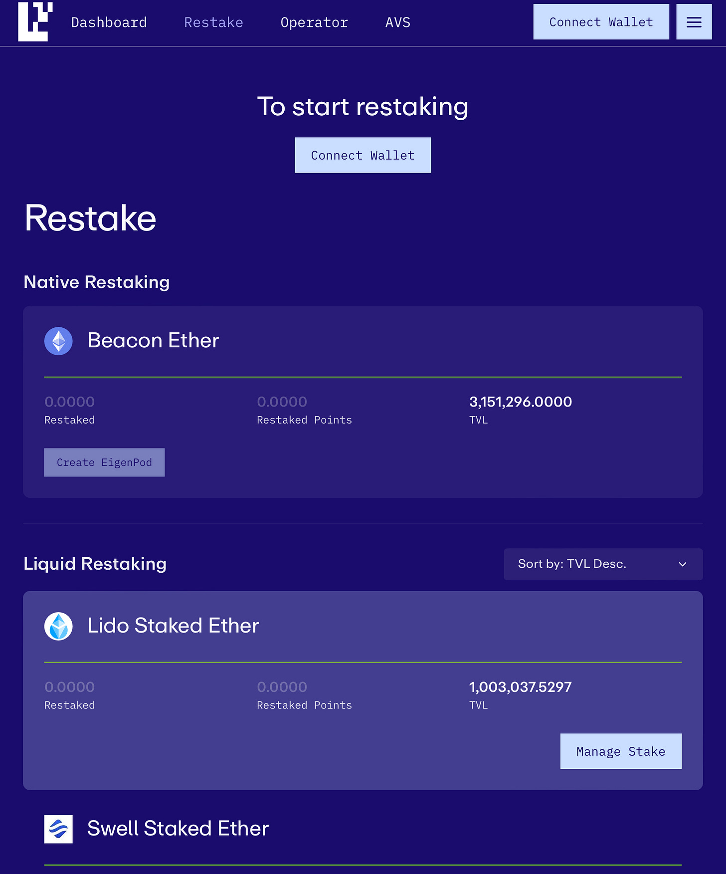 下圖是 EigenLayer 網站首頁,只要連接錢包並按照畫面左上方的頁籤(Restake、Operator)操作就能完成。