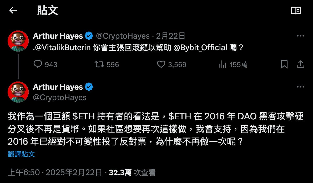 BitMEX 創辦人 Arthur Hayes 是「分叉以太坊討回竊款」的最大支持者。他直接標註 Vitalik Buterin 提問:「2016 年 The DAO 駭客事件損失 360 萬顆 ETH 時,你領導社群成功分叉以太坊。現在為何不考慮再試一次?」