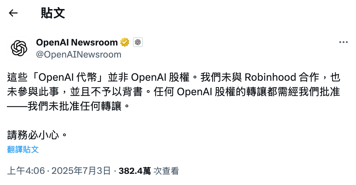 問題來了,OpenAI 和 SpaceX 兩家公司都還沒上市,哪來的股票代幣?對此,立陶宛央行要求 Robinhood 立刻說明。OpenAI 則強調 Robinhood 上的 OpenAI 代幣並不是股權。