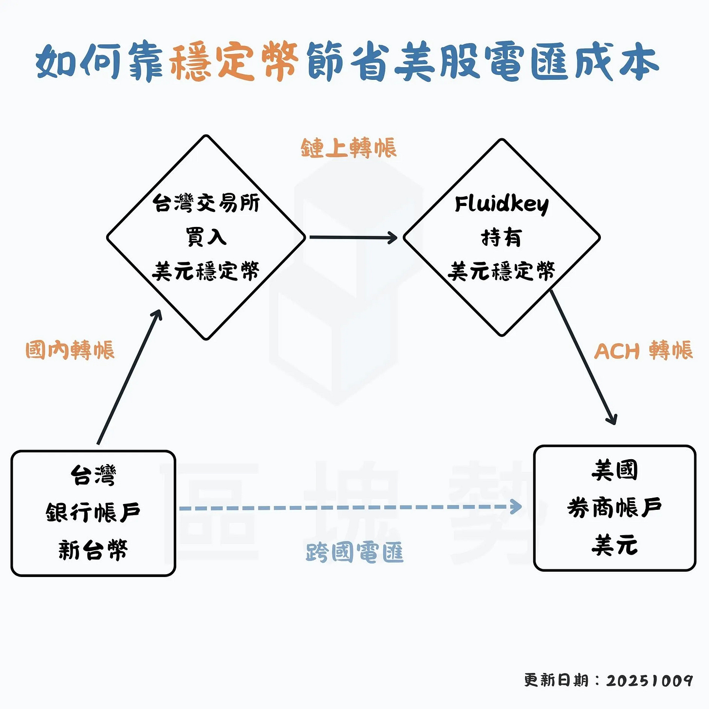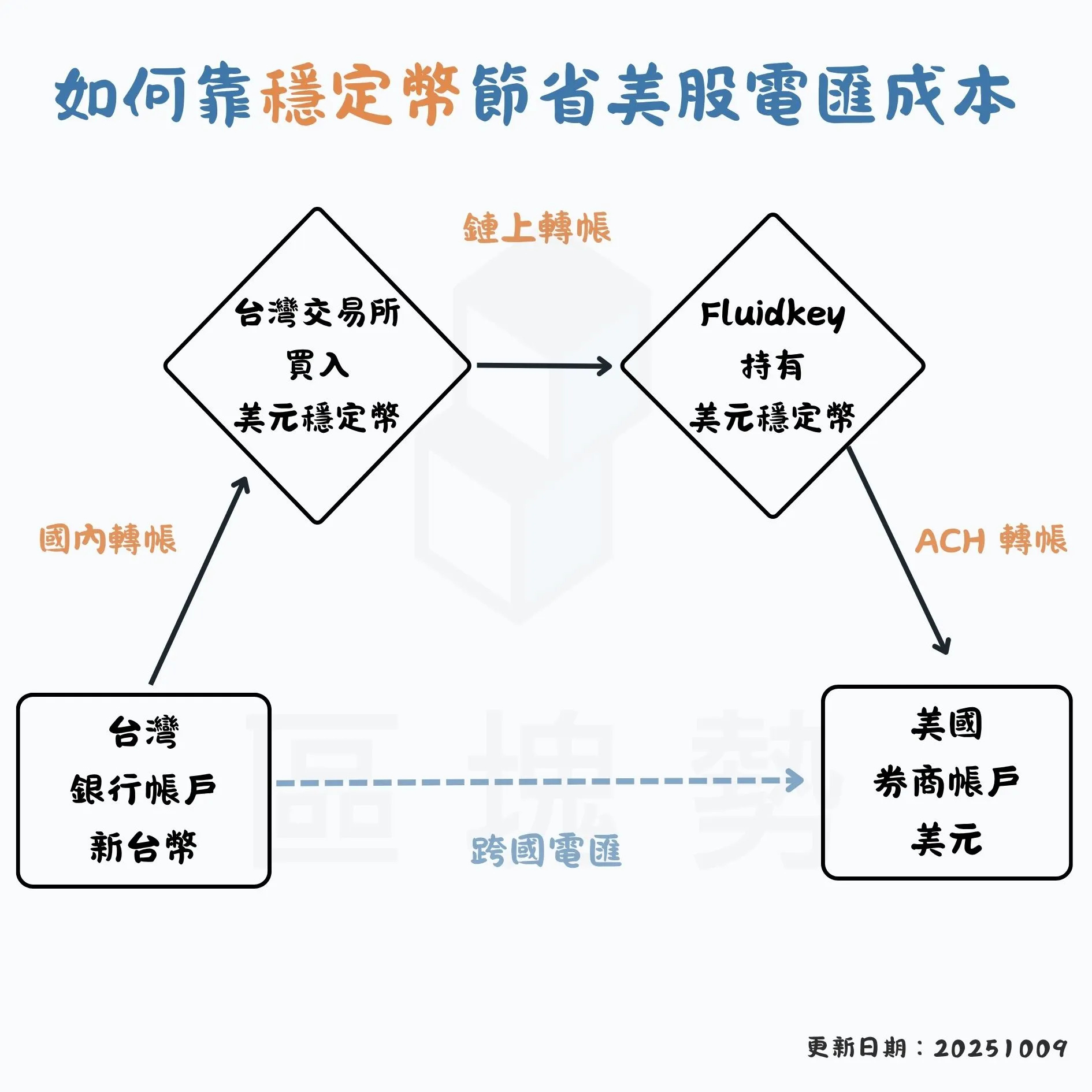 好消息是未來小資族可以改走穩定幣,以極低成本將錢轉到海外券商帳戶。雖然步驟比較多,但不僅到帳的速度更快,還可以把手續費壓到銅板價。下圖是我整理的實際操作流程: