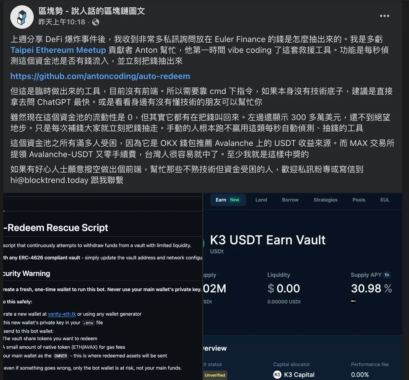 其中 Euler Finance 那筆幸運救回來,少繳了 7,000 美元的學費。我要特別感謝 DeFiHackLabs 的創辦人 Sun,以及 ETHTaipei 社群成員 Anton 在第一時間的大力幫忙。其中 Anton 二話不說就動手 vibe coding,寫出一套自動救援工具,由機器人代替我監控鏈上動態、贖回資產。我也才能專心完成文章,更在幾小時後就順利把所有資產抽回來。