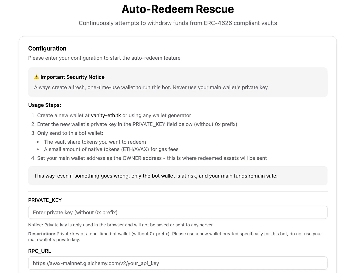 DeFi 自動救援機器人的原理很簡單。它會持續監控指定資金池(Vault)的鏈上動態,只要偵測到有新資金進來,就會立即幫你發起「贖回」交易,將你持有的資金池份額(shares)兌換回原始資產,並自動送回你指定的錢包地址。