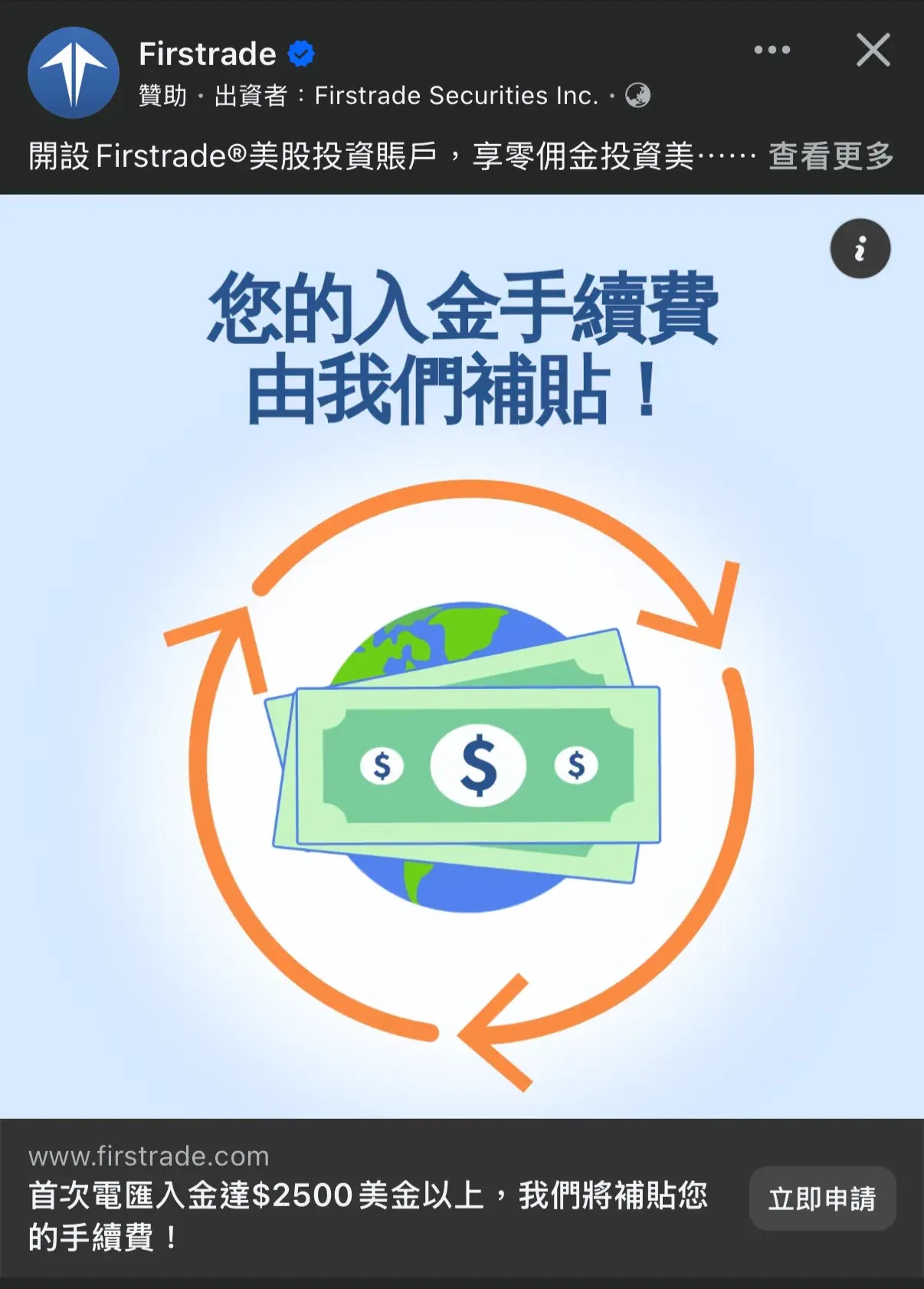 最近我的社群平台上常出現 Firstrade 廣告,推坑我投資美股(如下圖)。只要首次電匯入金超過 2,500 美元,Firstrade 就會補貼 25 美元電匯手續費。但這廣告恐怕再過不久就要換掉了,因為 Firstrade 的競爭對手盈透證券(Interactive Broker,IB)已經宣布開放穩定幣入金。