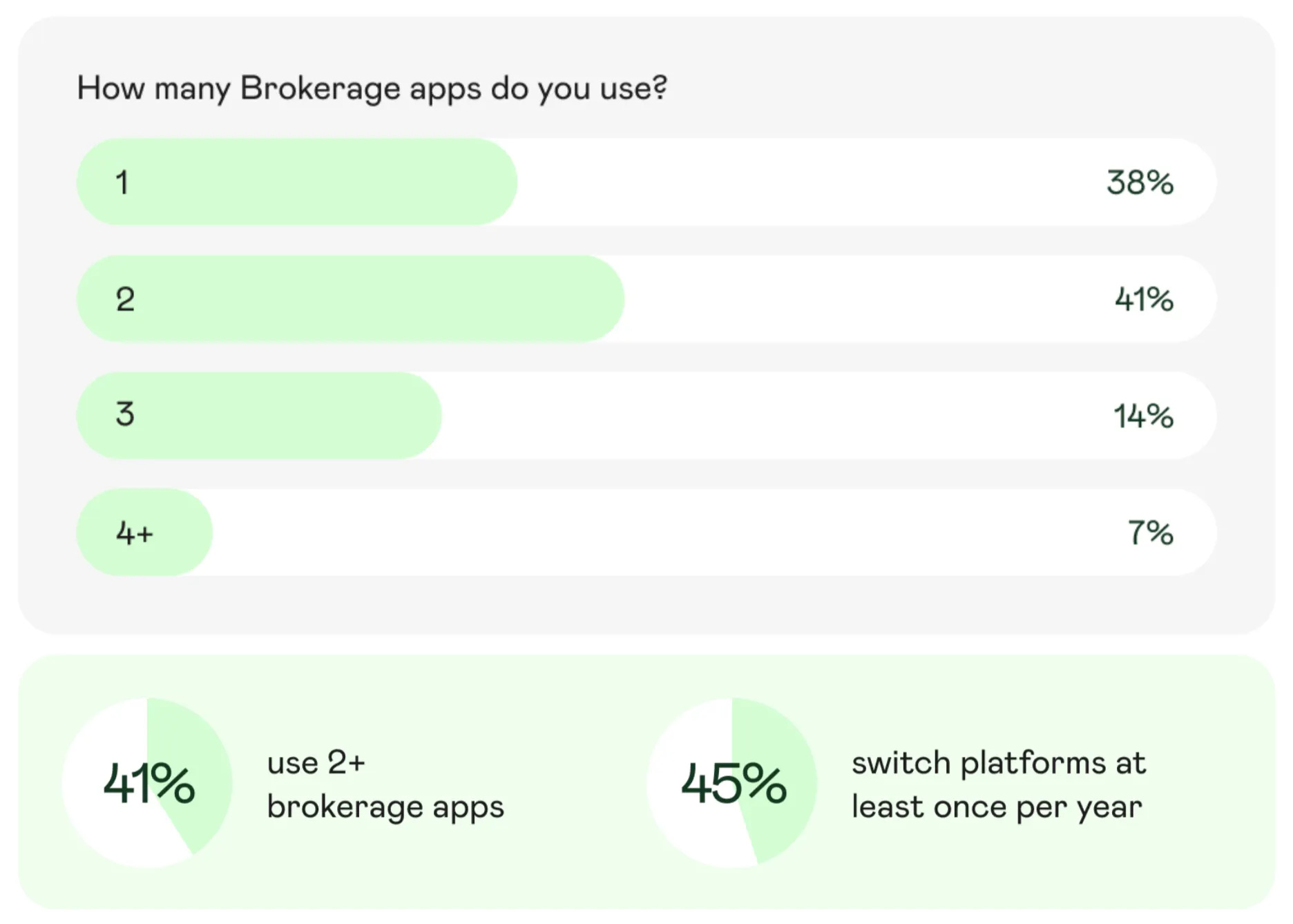 許多人因此額外註冊嘉信、盈透帳戶,甚至有人決定跳槽。原本我以為這只是少數人的選擇,不過有另一份調查報告指出,券商之間的競爭相當激烈,訪問全球 2,000 位海外券商使用者後發現,竟有高達 62% 不只使用一款券商 app,更有 45% 每年都會換一家券商。