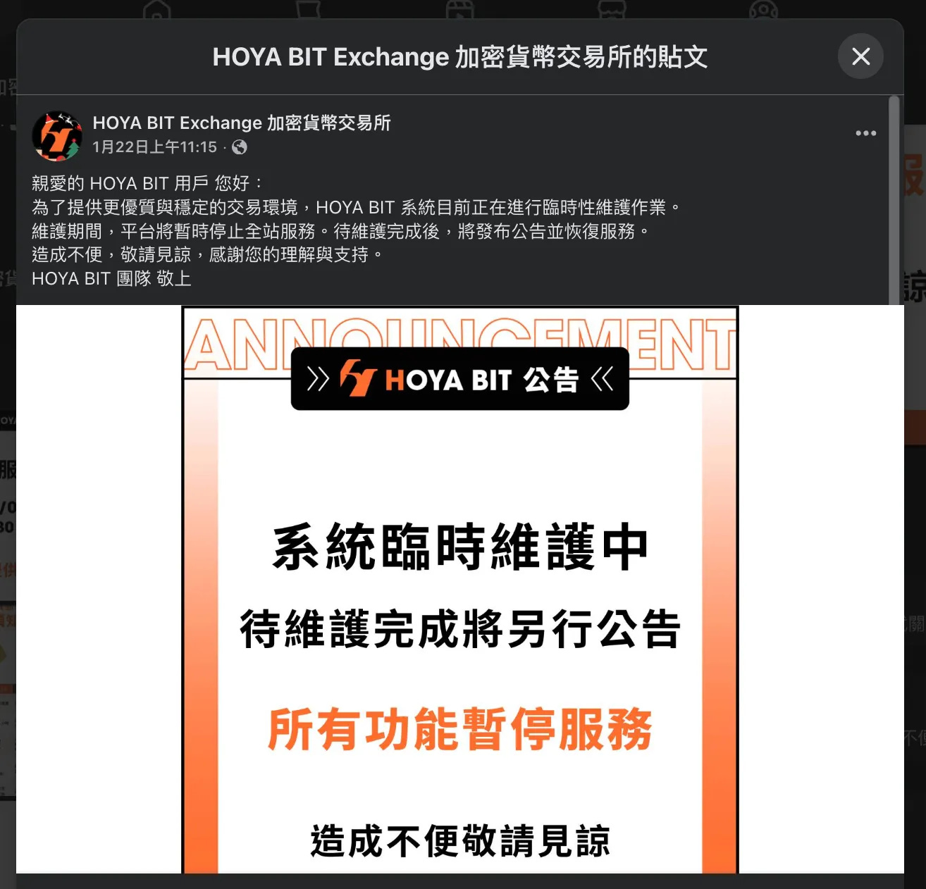 台灣時間 1 月 22 日上午 11 點,HOYA BIT 交易所在臉書貼出臨時維護公告,宣布平台所有功能暫停服務,恢復時間未定。資訊交代得少,通常都不是好兆頭。代表連交易所內部都還沒釐清狀況。