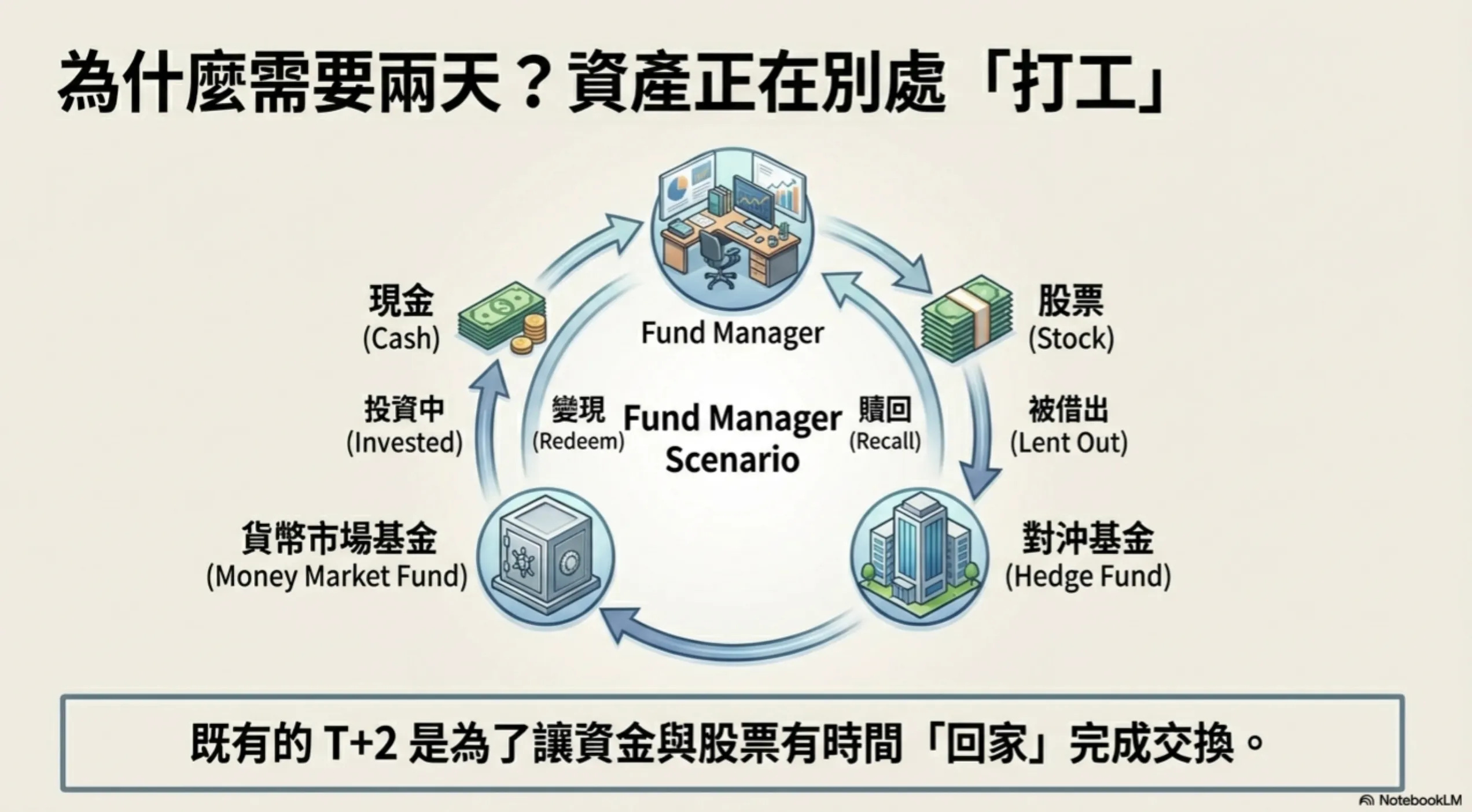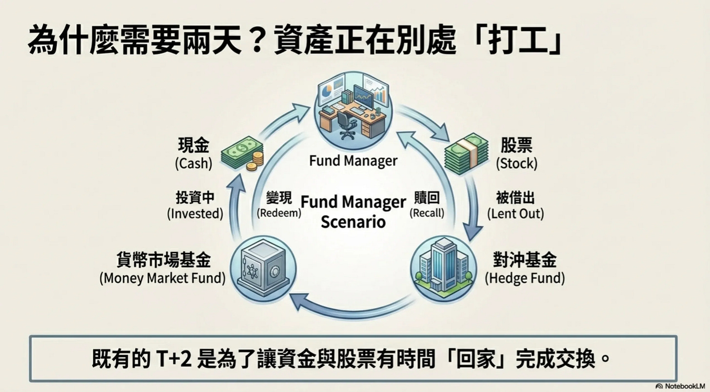 另一方面,退休基金的管理者聽到你的股票不在手上也很開心,因為其實他手上的現金都已經存入低風險的貨幣市場基金賺收益,也需要花點時間把錢贖回來。最後你們說好兩天後面交,這就是股票的 T+2 交割。