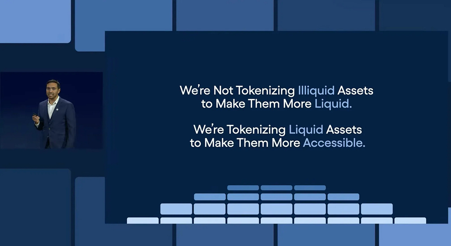 全球最大美債、美股代幣發行者 Ondo Finance 上週在紐約舉辦高峰會。Ondo 直接點名,過去 RWA(Real World Assets)把重點放在將名畫、房地產等非流動性資產代幣化,其實走錯了方向,因為 RWA 的真正潛力在於讓股票、債券這類大家本來就頻繁買賣的流動性資產,變得更容易取得。