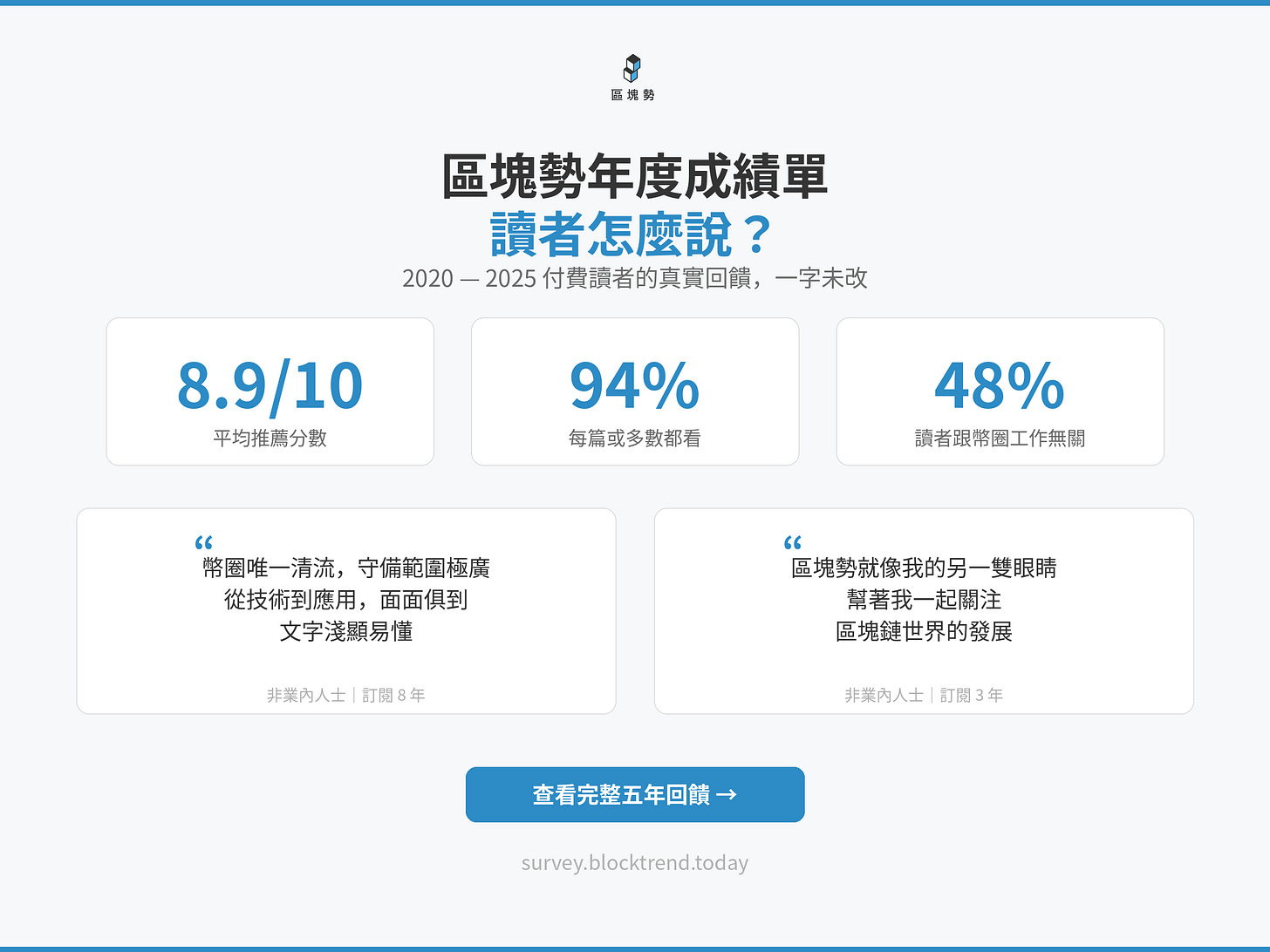 先說好的部分。不管問卷怎麼設計,讀者五年來寫下的答案幾乎沒變過。從 2020 到 2025,大家反覆提到的都是深入淺出、有溫度和說人話。這五年區塊鏈產業天翻地覆,從最初的 DeFi Summer 到 FTX 倒閉再到近期穩定幣爆發。但讀者在意的核心價值都沒變,至少寫作方向沒有走偏。