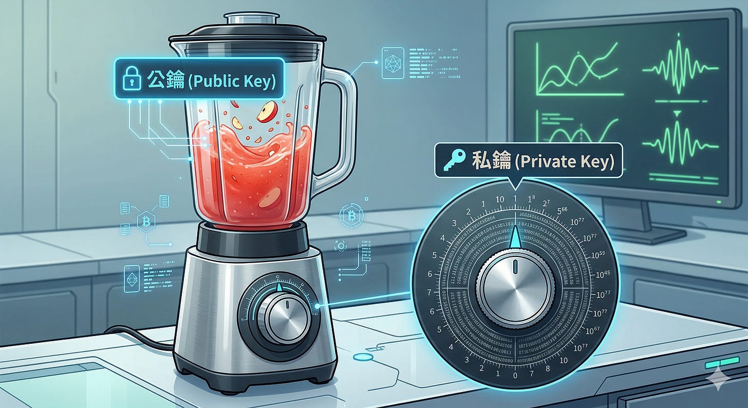 這就是目前加密貨幣採用的「橢圓曲線密碼學」(Elliptic Curve Cryptography)原理。打好的那杯果汁是公鑰,而果汁機上的刻度數字則是私鑰。