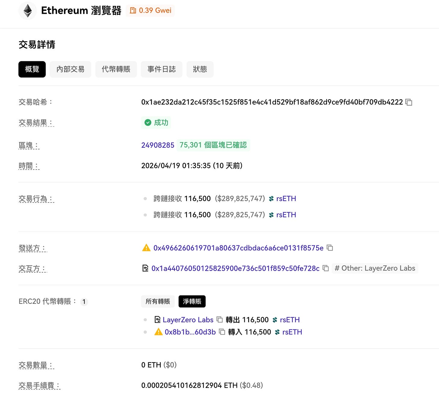 台灣時間 2026 年 4 月 19 日週日凌晨 1 點 30 分,多數人都已熟睡,鏈上卻出現一筆大額轉帳記錄。有人透過跨鏈橋 LayerZero 轉出價值約 2.9 億美元、共 116,500 顆 rsETH 代幣。