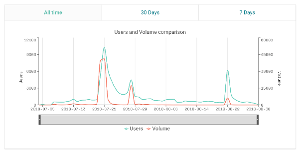 上圖中,最左邊的高峰是 Fomo3D 剛開始的人熱潮,中間人數劇減。因為越晚參加的人越難獲利,只能賭自己是最後一位買鑰匙的人。中間的高峰則是 Fomo3D 短版上線所引發的熱潮,將時間上限從 24 小時修正為 5 分鐘,玩法更刺激但人數、資金同樣下降得很快。最右邊的高峰是第一輪 Fomo3D 結束,且隨即啟動第二輪 Fomo3D 遊戲所造成的熱潮。