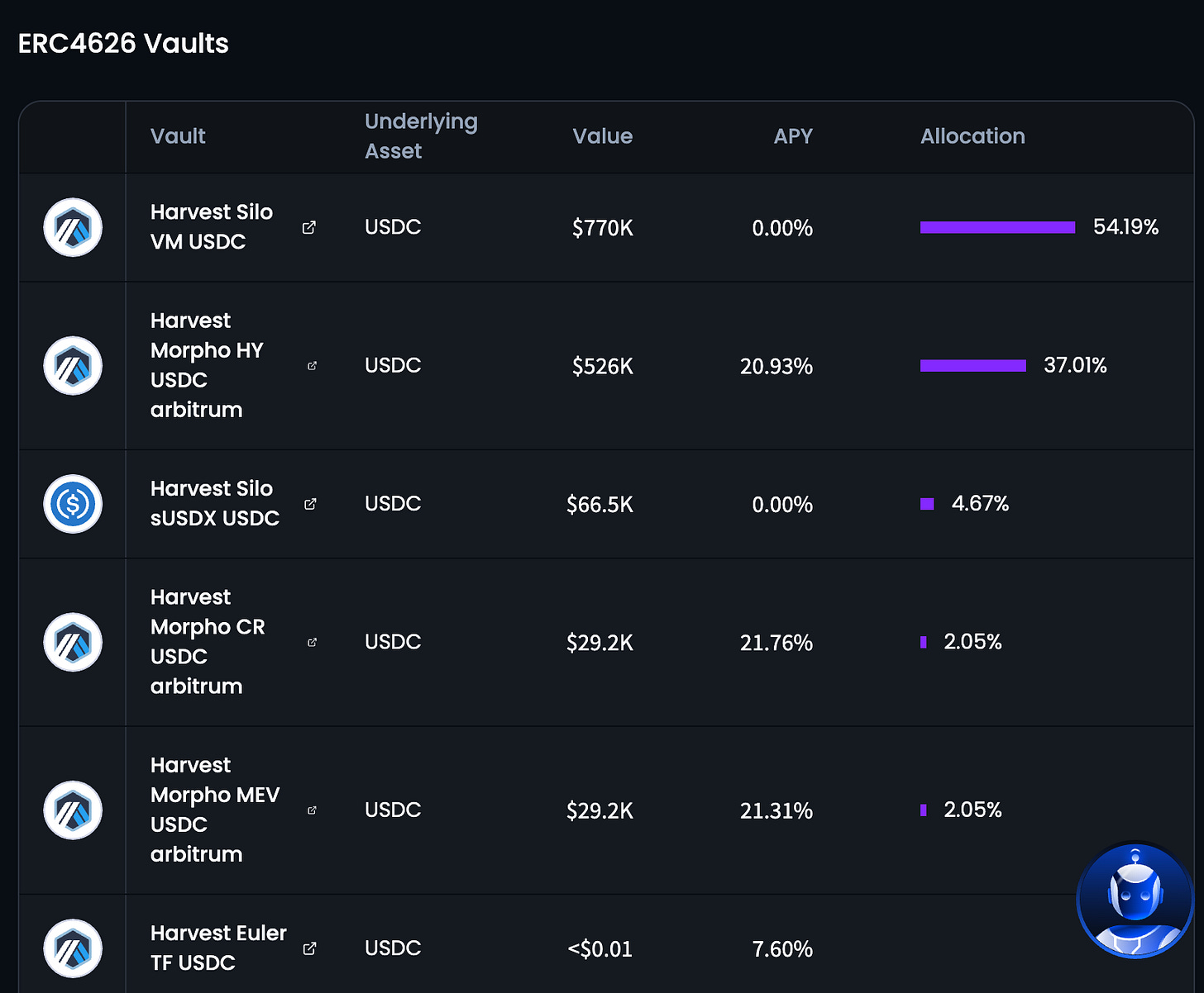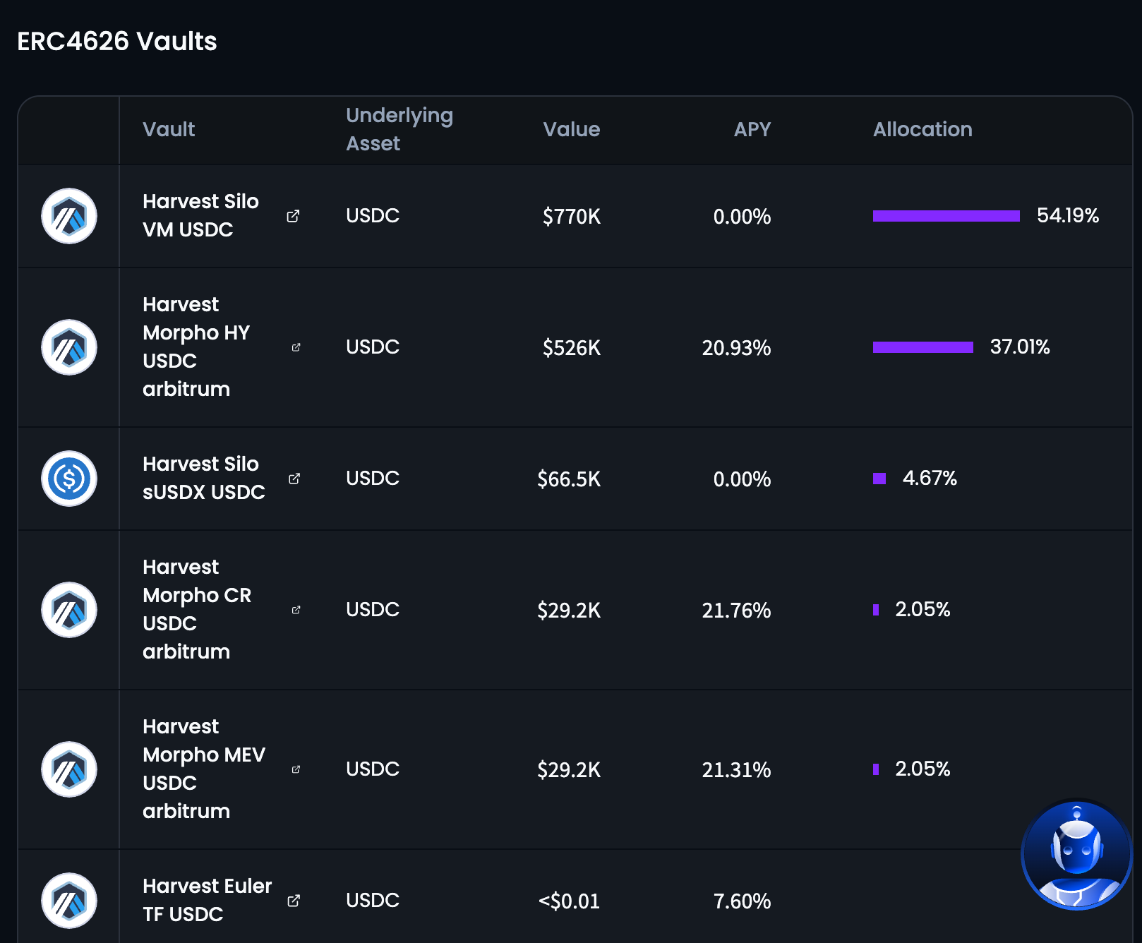 Harvest Finance 的「自動駕駛金庫」(Autopilot)會自動把資金分散到不同借貸平台。就像把錢交給基金經理,使用者只需支付績效費,經理就會替你監控哪裡收益率更高,並馬上把資金挪過去。這解決了 DeFi 的一大麻煩 —— 收益率每秒都在變,而且不定期會有補貼活動,手動調整不可能跟得上機器人,交給「自動導航金庫」管理最省心。此外,金庫介面會披露資金分配與收益來源。平均年化報酬落在 10% 左右,算是中規中矩。