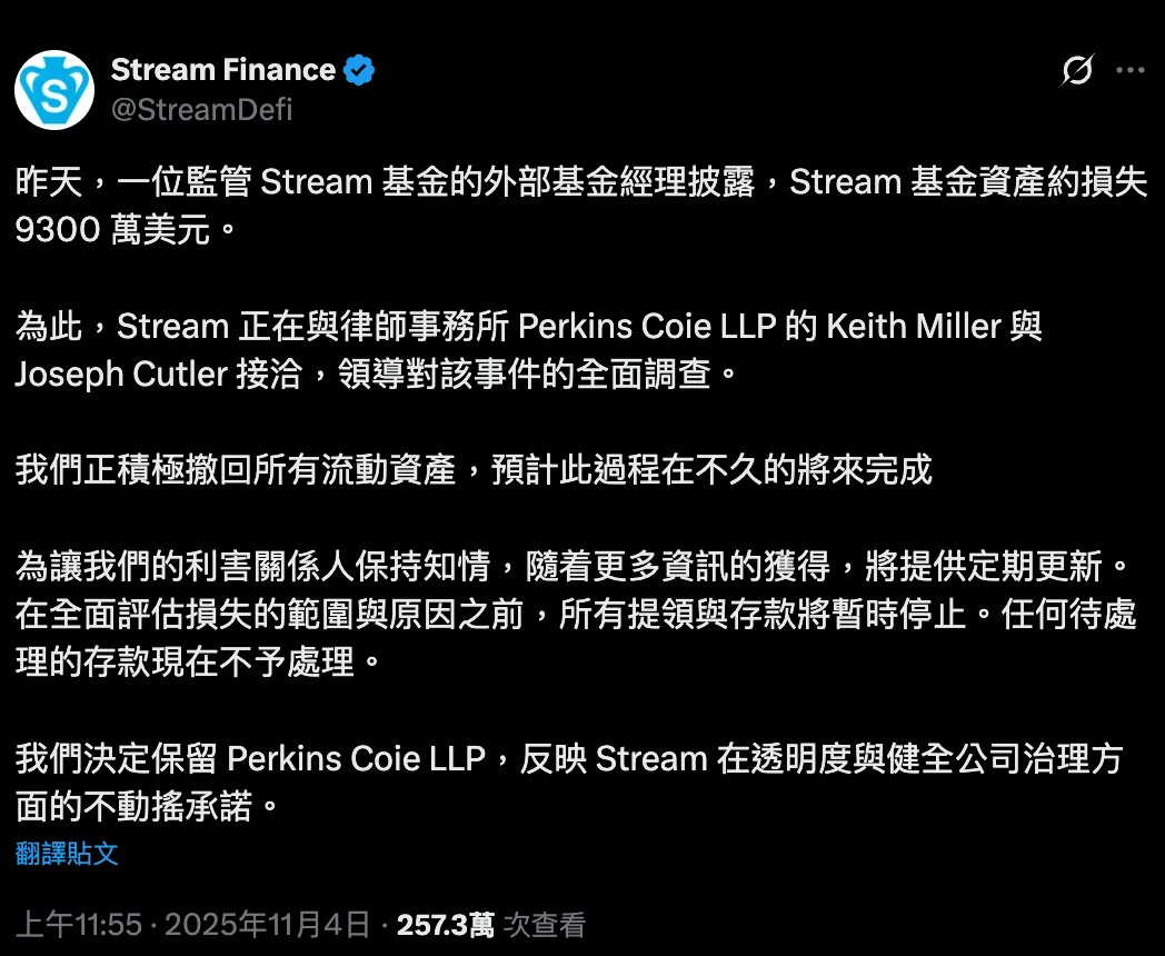 漏洞就出在這裡。前天 Stream Finance 在社群平台上發佈公告,稱「外部管理者」告知他們有多達 9,300 萬美元的壞帳。所謂「壞帳」就是錢已經不知去向。市場上 xUSD 持有者換不回美元,xUSD 價值一夕崩盤。但最糟的還在後頭。