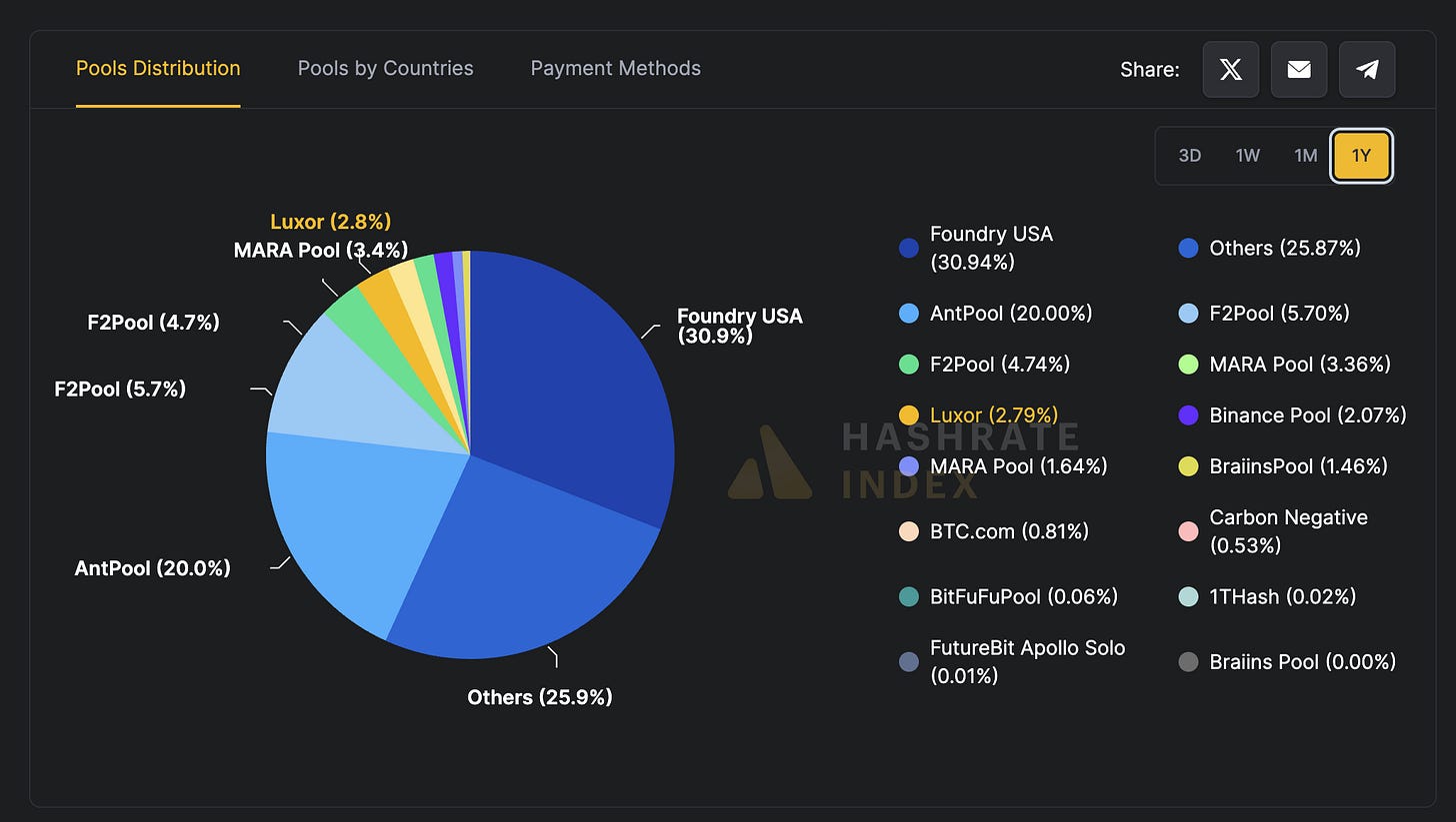 從目前的算力分布圖來看,前兩大礦池 —— Foundry USA(30.9%)與 AntPool(20%)—— 合計掌控過半算力。再加上 F2Pool、MARA,前四大礦池合計算力已逼近全球三分之二。換言之,比特幣並不是靠高度分散來維持安全,而是靠幾個挖礦巨頭的共同利益維持恐怖平衡。社群則默認,這些大型礦池是與大家利益一致的守門人。
