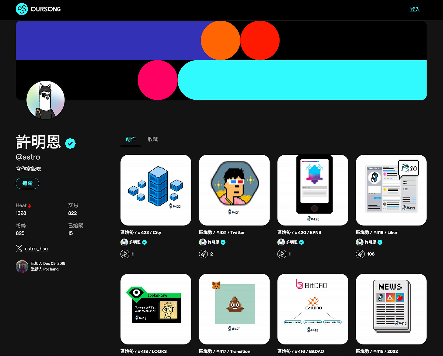 OurSong 是最容易上手的 NFT 發行、交易平台。區塊勢就是平台上首批創作者,在 NFT 還沒那麼流行時就發行文章 NFT 供讀者收藏。不久之後,師大夜市名店師園鹽酥雞在 OurSong 發行 NFT 商品兌換券,讓 OurSong 一炮而紅。