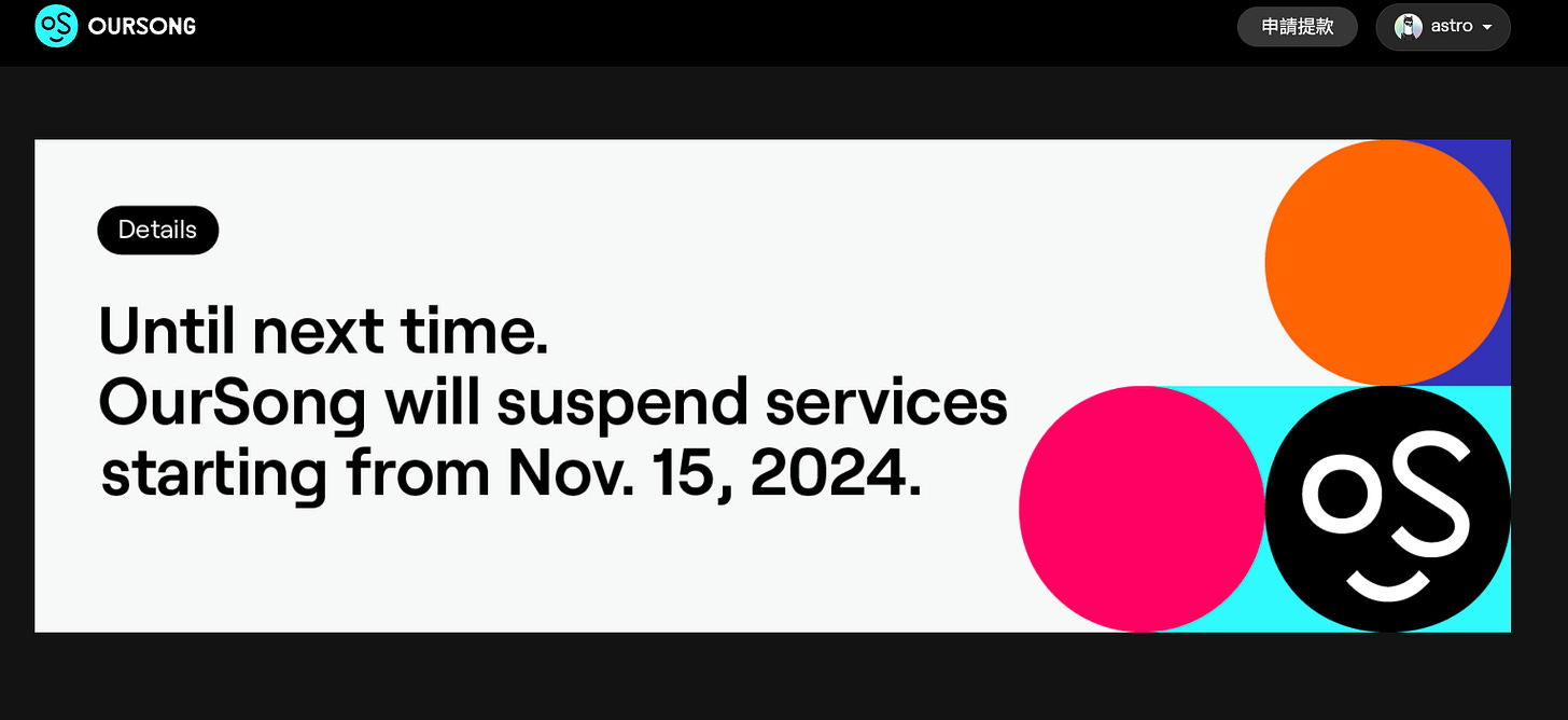 由於 OurSong 原本使用的金流系統 Circle 終止其金流相關業務,OurSong 將變更原有的交易模式並進行轉型,在此之前我們將暫停服務。OurSong 將於 2024 年 11 月 30 日暫停除了出金功能之外的所有服務。在此之前,您仍可正常訪問,並對您的個人帳號數據進行處理。OurSong App 將在 2024 年 10 月 15 日停止下載,並在 2024 年 11 月 15 日暫停服務。若您需要提領帳戶內的 OSD,依然可以透過網頁版進行操作。